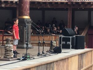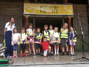 On Monday a small group of children from year 3 and 4 went on an adventure; our school’s first ever trip to London! We went to support Caspar, who was the South West finalist in the Poetry by Heart competition. He was performing his poem in the national finals at the Globe Theatre in London and was one of the youngest children taking part. He looked very small on the enormous stage! We were allowed to take 8 children to watch the finals so selected the runner-up children whose video performances had been entered into the competition back at school.