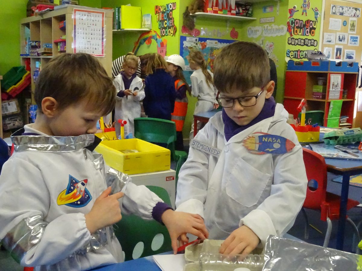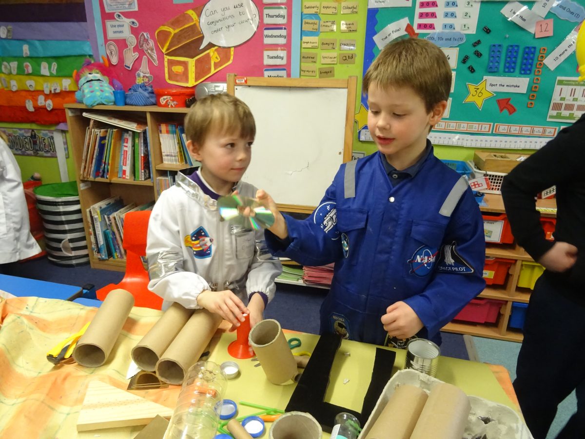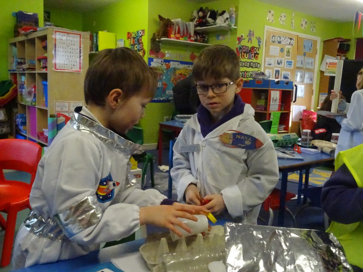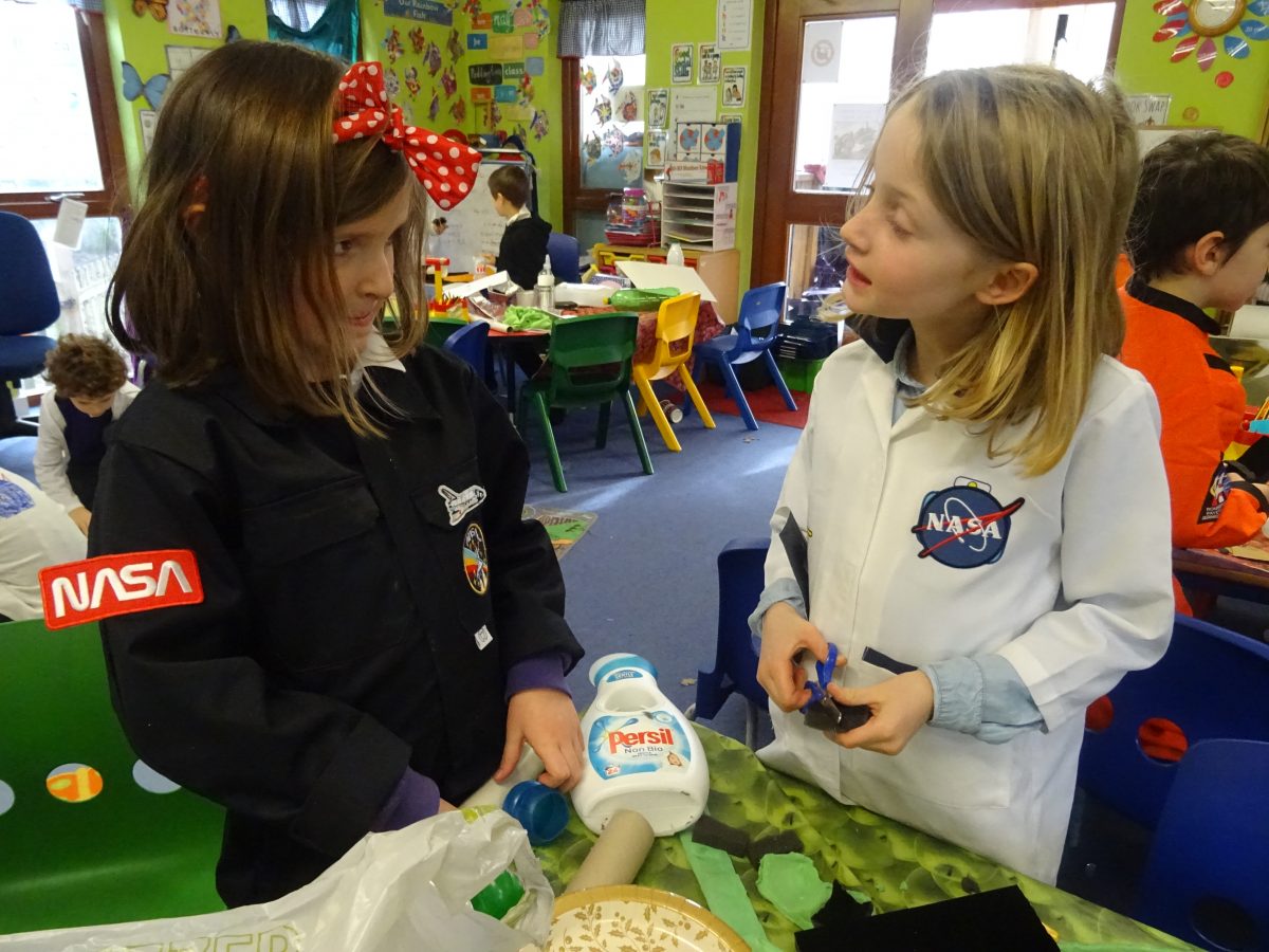 The children's finished spacecraft are a celebration of creativity....