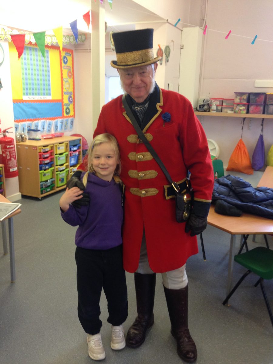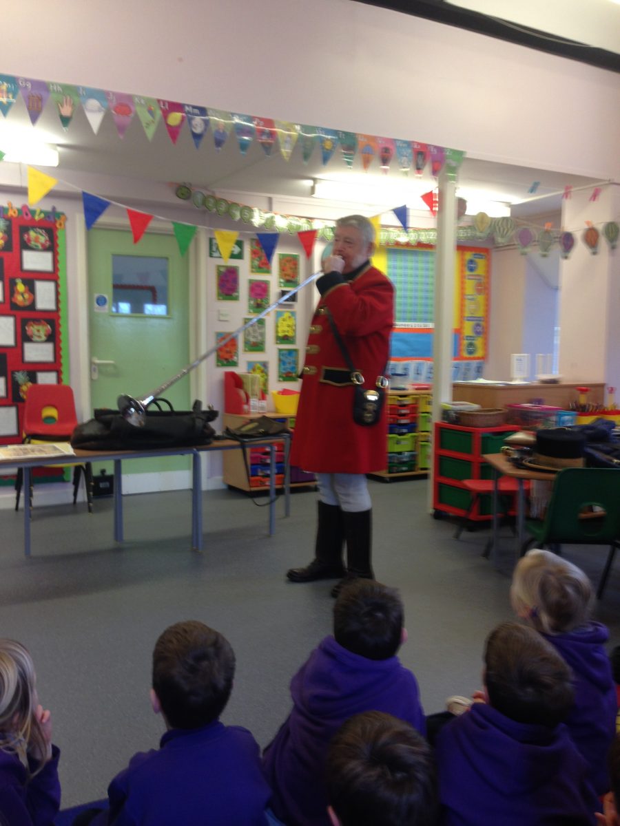Martin Horler visited Elmer class on Wednesday 13th November to talk to the children about the role of the Royal Mail Guard and what life was really like on-board a mail carriage travelling from London to Bath in the 1800’s. He arrived in his coachman’s uniform and revealed a huge leather bag containing a leather mail bag, horn, a Flintlock pistol, a Blunderbuss and a Cutlass. The children learnt how important it was for the mail carriage to be on time and so to ensure the carriage kept moving, a horn was blown to give messages to others using the roads or manning the tolls. Mr Howler played a selection of the calls; ‘clear the road’, ‘we’re not stopping’ and the children had a go too!