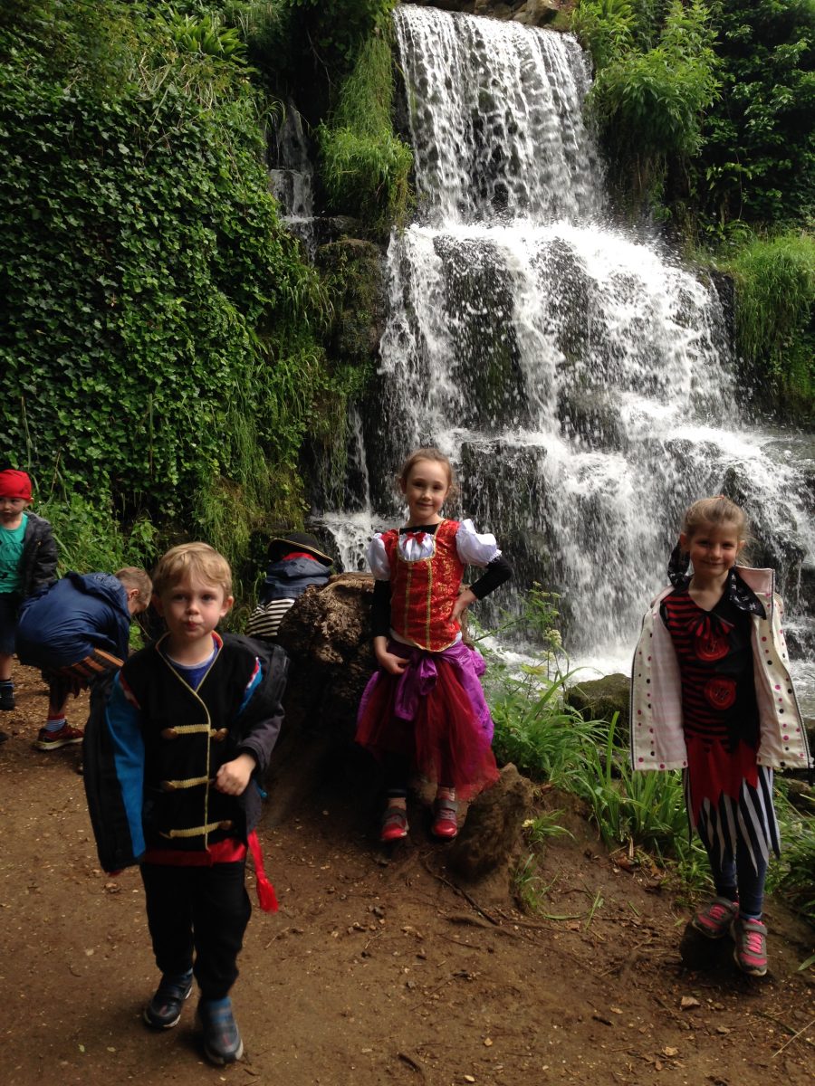 Continuing down the hill we discovered the lake, grotto and a stalactite cave. We broke into groups to explore the grottos, a dark tunnel, waterfall and stepping stones. Then across the lawn full of Canada Geese, past the big house and through the beautiful formal rose gardens. Here we took the time to smell all the different coloured flowers. Lunch back at the Bothy and then a fantastic hour and a half in the adventure playground and on the huge pirate ship.