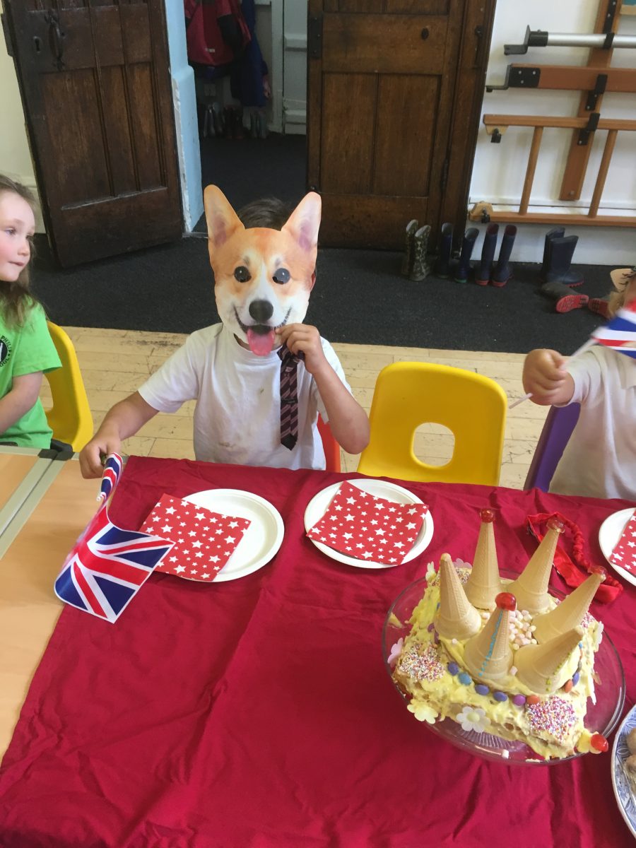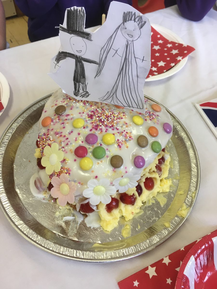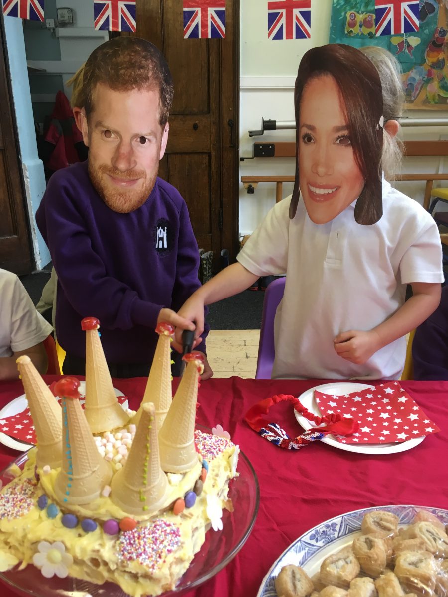Harry and Megan were in Norton st. Philip on the last day of term along with other members of the Royal family. They came to taste the three delicious wedding cakes that Gruffalo Class had baked and decorated. We played the wedding march as the newlyweds walked into the hall and stood for the National Anthem when the Queen and her corgis arrived. The cake was cut and we toasted the royal couple with some ‘champagne’ and admired each other’s fancy wedding hats.