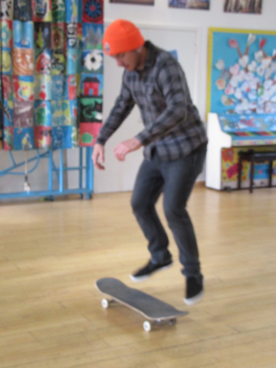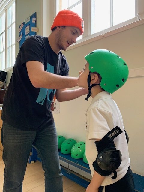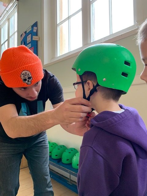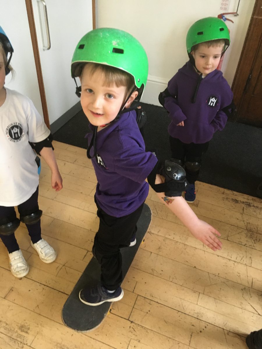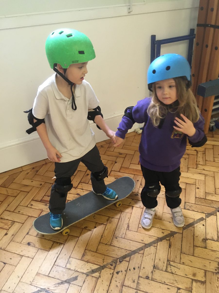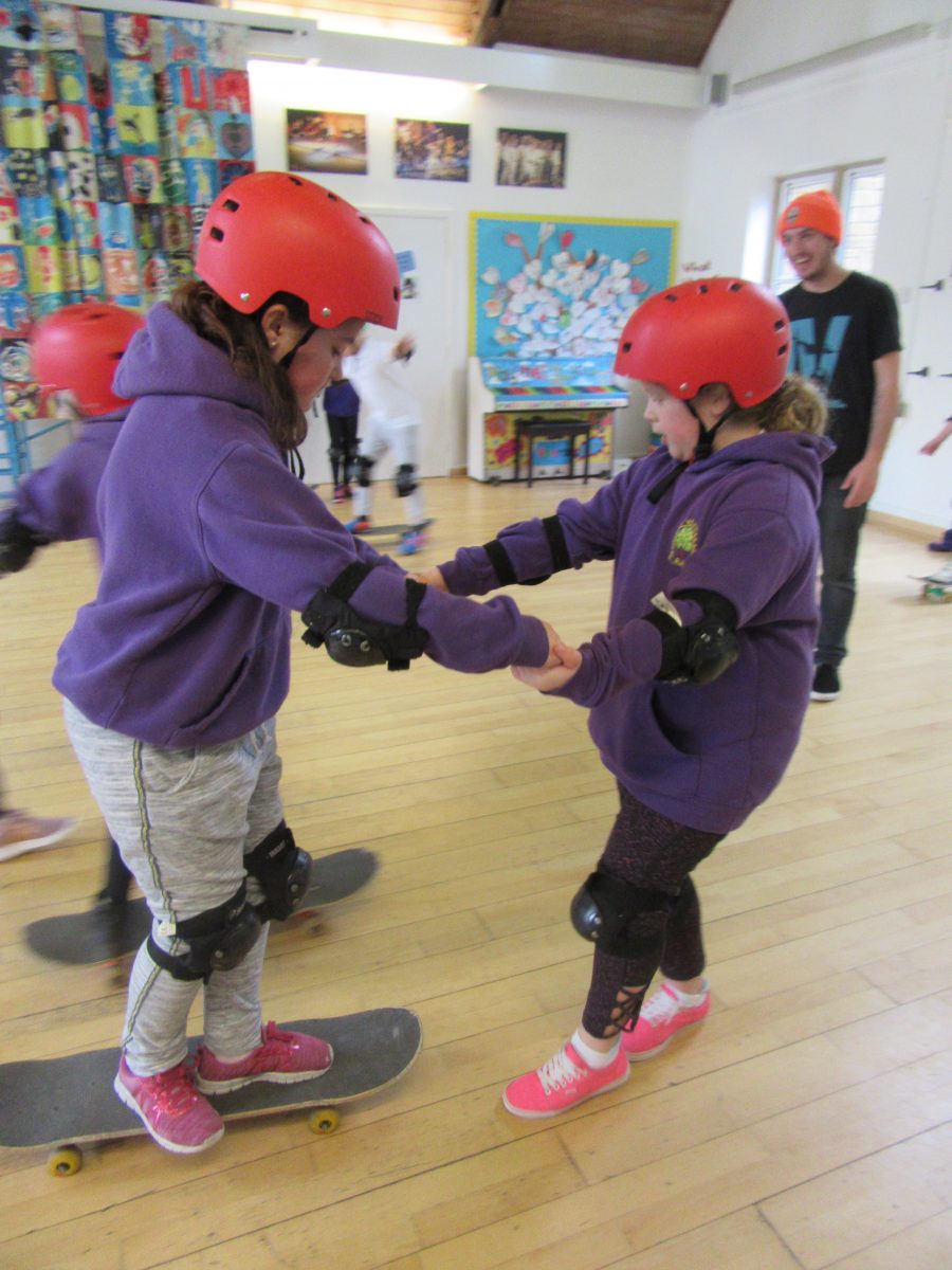 The children started our sessions by going over the basics; wearing the correct gear and standing on the board! After this, they learned how to move with the board and how to face their body in the directions of travel. For a first time skater this is no easy task and the children worked incredibly well to master this new skill. The support and encouragement they gave to each other was awesome. Once the basics movements had been covered, the children moved onto tricks. They tried flipping boards over (kick flips), moving their boards in a circle (board spins) and holding onto their board whilst it was in motion.